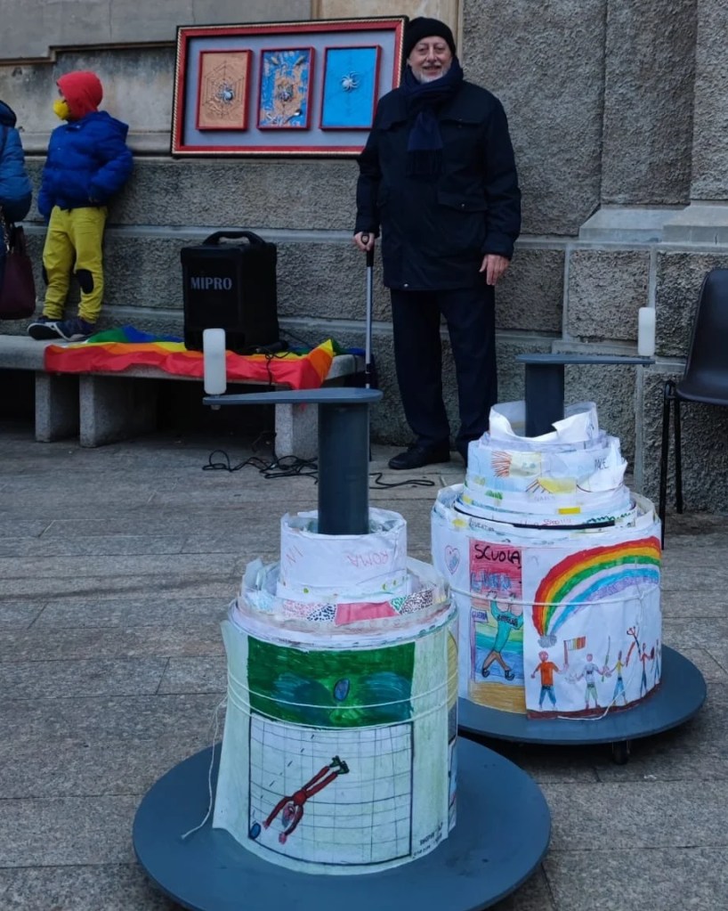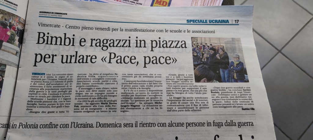 Questa opera è nata da sé seguendo il mio subconscio che ha anticipato quello che sarebbe successo dopo pochi mesi all’Ucraina. Questa è la storia tra miti e leggende locali. Nel dicembre del 2021, acquistai 3 tele al “Riciclone” di Vimercate (MB), luoghi in cui è possibile recuperare cose ancora in buono stato (nel mio caso erano addirittura nuove), che spesso la gente butta via per liberare gli scantinati. Metto queste 3 tele in vista nel mio laboratorio di pittura in attesa che mi venisse in mente cosa farne, quando inavvertitamente mi cade a terra una boccetta di vetro colore blu e per non buttarla, la uso per ricoprire integralmente di quel colore una delle 3 tele; con il residuo copro parzialmente anche la seconda tela. Dopo qualche giorno inavvertitamente rompo anche una boccetta di colore oro, con cui dipingo per non buttarla, la tela bianca rimasta e quella che avevo dipinto con l’avanzo del colore blu. Penso a cosa metterci dentro e il mio occhio si posa su 3 ragni argentei comprati a Halloween e decido, facendomi aiutare dal Maestro Ennio Bencini e dal mio amico Gianni Sonzogni, di realizzare 3 ragnatele, rispettivamente con filo di rame e di ferro, agli estremi delle tele monocolori, e d’ottone dorato al centro (sulla tela a colori misti). Il trittico lo riporto poi su un compensato più grande sul quale realizzo delle cornici d’oro e rosse. A quel punto a gennaio 2022 sentivo di dover mettere una chiave, ma non sapevo dove collocarla, provai anche a inserire 3 serpenti, ma stonavano. A quel punto lasciai ferma l’opera in attesa di nuove idee e che mi ristabilissi da un’operazione chirurgica a cui mi ero sottoposto. Il 27 Febbraio 2022 mi sveglio al mattino e mi viene l’intuizione, i colori da me utilizzati “casualmente” erano quelli della bandiera ucraina (l’oro delle messi e l’azzurro della speranza). I due pezzi della bandiera erano divisi dalla tela in cui i colori erano mischiati, a individuare la scissione e frammentazione dell’Ucraina. A quel punto cercai di capire quale fosse il significato del ragno in Ucraina e questa è la leggenda che Vi riporto. Quando pensiamo ai simboli di Natale, la tradizione ci fa venire in mente fiocchi, cristalli di neve, campanelli e ghirlande, solo per citarne alcuni, ma in alcuni Paesi, non molto distanti da noi, più di qualcuno risponderebbe i ragni. Suona bizzarro, ma proprio le ragnatele sono tra gli addobbi più comunemente usati per gli alberi di Natale in Ucraina e Germania. Gli animaletti a otto zampe che siamo soliti collegare al tempo di Halloween, abbondano invece durante le Feste natalizie, semplicemente varcando le Alpi. Si tratta di un’usanza popolare tipica della tradizione Mitteleuropea che risalirebbe a un’antica storia tramandata di generazione in generazione. La protagonista è una madre vedova e del figlioletto, in condizioni di miseria tanto da non potersi permettere di festeggiare il Natale. La sorte per aiutarli fece spezzare un ramo di un grande abete, per il peso della neve e questo cadendo si conficcò nel terreno dando vita a un piccolo albero di Natale. Il bambino lo vide e chiese alla mamma di addobbarlo, ma la mamma fu costretta a rispondere che non potevano permetterselo in quanto poverissimi. Lo stato di miseria in cui viveva quella famiglia, impietosì alcuni ragni che cominciarono a tessere la loro tela sull’abete; così, la mattina di Natale, la vedova con i suoi bimbi trovarono il sempreverde decorato di tutto punto. Splendente alla luce del sole, l’albero brillava di riflessi d’oro e d’argento. Fu l’inizio di una serie di vicende fortunate. In Ucraina il Natale si festeggia il 7 gennaio e il 6 è quindi il giorno della Vigilia, che si solennizza con una grande cena. Una volta che il pasto è finito si lascia sulla tavola la “Kuotia”, una chiave, e un certo numero di cucchiai, che corrisponde al numero dei parenti defunti, al fine far partecipare alla festa anche loro (https://www.universalia3.it/wp-content/uploads/2020/12/Le-Tradizioni-di-NATALE.pdf). A fronte di tale lettura ho capito come dovevo ultimare il quadro, ovvero mettere sotto la tela mista, una chiave e una posata d’argento e tracciare sul ragno una croce rosso sangue, a ricordare i martiri di questa guerra (e mi riferisco anche ai soldati russi costretti a fare la guerra e non solo ucraini), ma allo stesso tempo a dare una speranza che se ne possa uscire pacificamente. Dopo questa visione il 28.02.2022 sono iniziati i primi colloqui di pace tra le parti belligeranti. All’opera, infine, ho aggiunto due spighe di grano, per completare l’augurio di prosperità e abbondanza di messi, ma anche come auspicio che cessi questo inutile spargimento di sangue. L’opera nelle mie intenzioni va venduta e con il ricavato, il 50% deve essere utilizzato per aiuti umanitari a favore del popolo Ucraino e il restante 50%, devoluto alle madri dei soldati russi che hanno perduto la vita in una guerra non voluta. Sarà poca cosa, ma spero basti per comprare un girasole, come augurio di pace e prosperità anche per il popolo russo. Michelangelo Magnus (Pittore di pace ad Assisi) Sotto trovate particolare dell’opera e dei media e una foto del disegno più lungo del mondo (su carta assemblata A3): “La pace e lo sport come strumento di pace visto con gli occhi dei bambini” realizzato da me e1800 bambini brianzoli e milanesi nel 2011 (misura Km. 1,134), oggi 15/25enni.